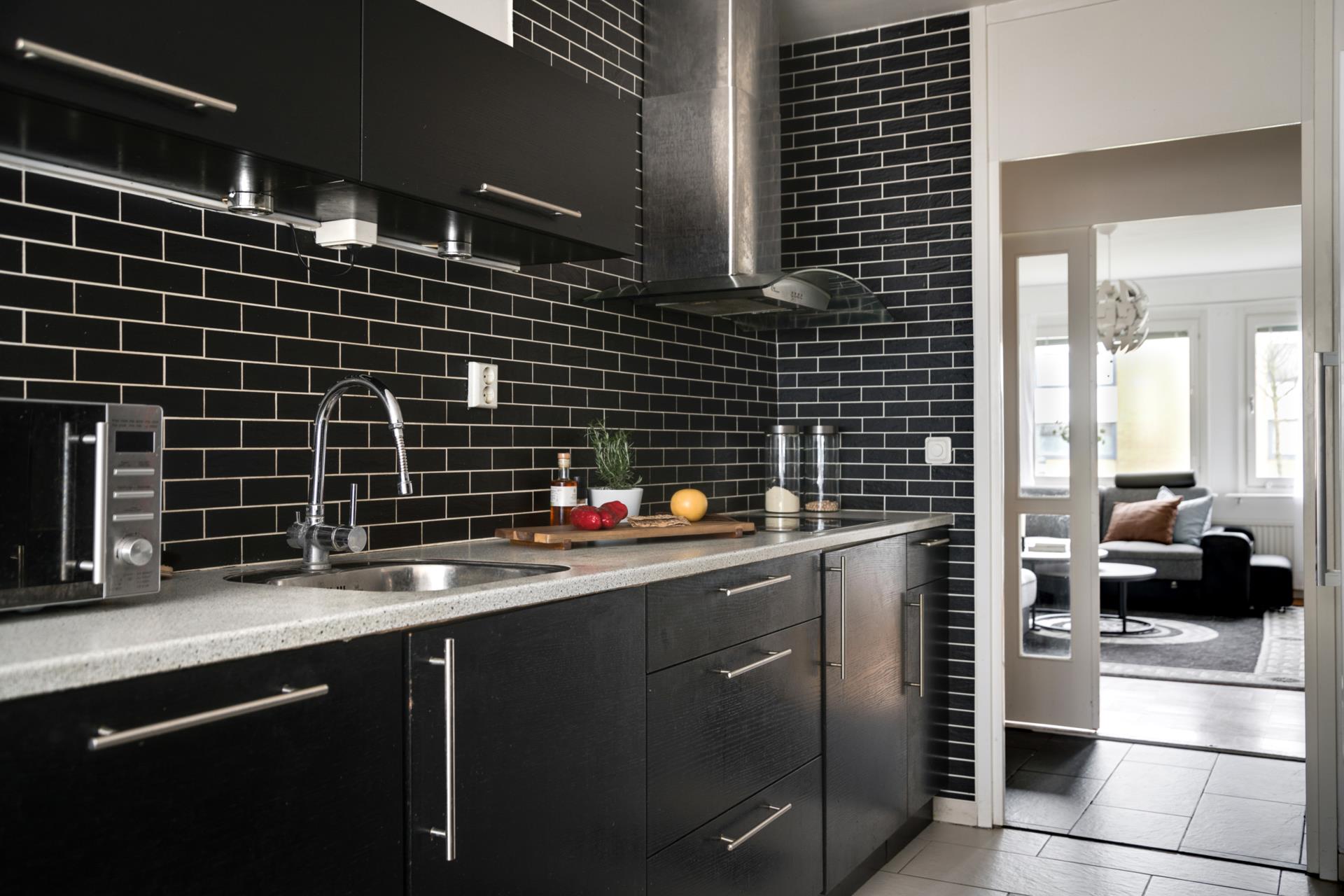 Det smakfulla köket är i en mörk kulör och är modernt utrustat. Här har man plats för matbord med stolar. Härifrån nås dessutom den härliga inglasade balkongen.