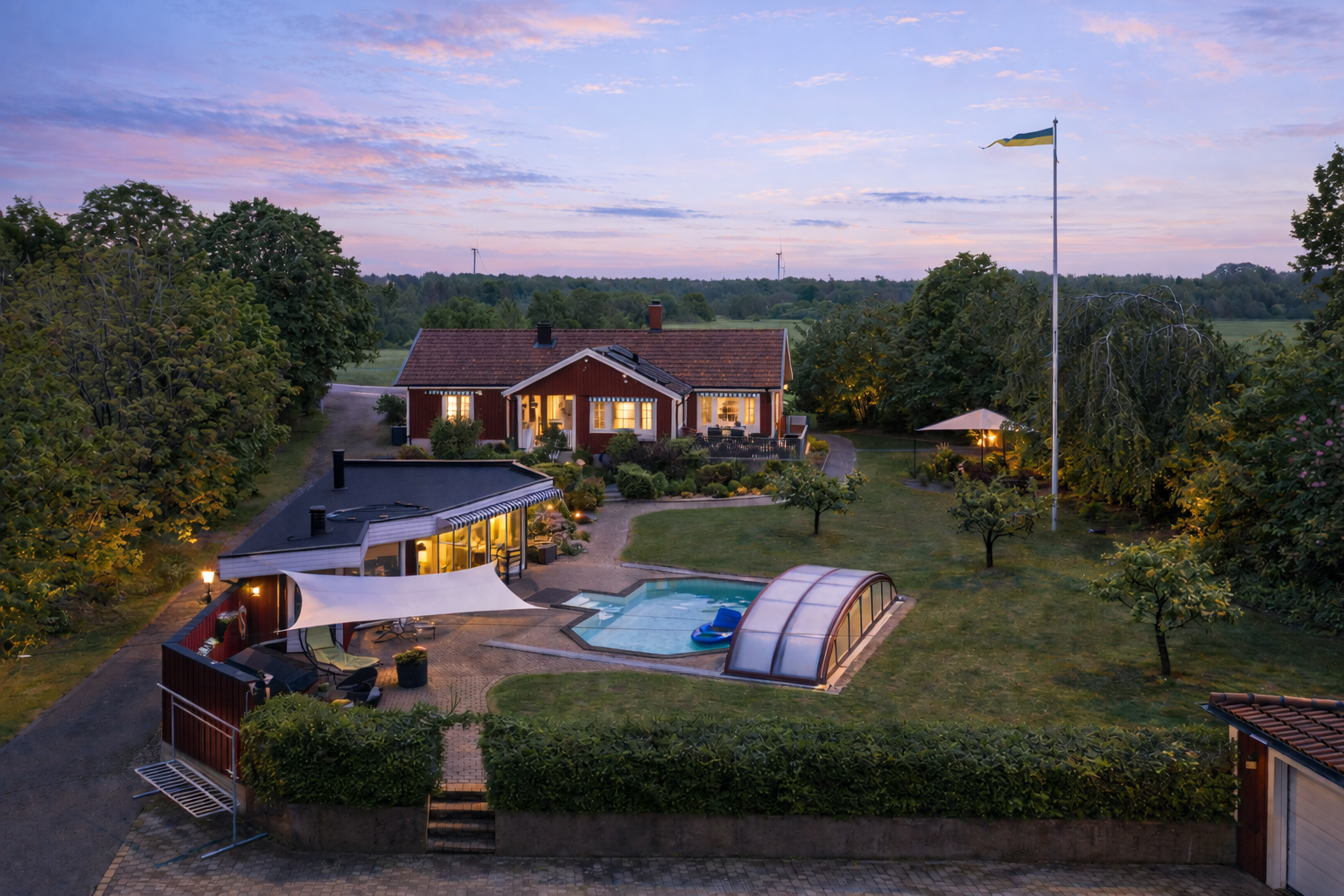 Välkommen till en sällsynt möjlighet att förvärva en helt unik fastighet där lugn, rymd och livskvalitet samsas i natursköna omgivningar. På en insynsskyddad tomt om hela 14 810 kvadratmeter, inramad av lummiga träd och vacker natur, ligger denna generösa fastighet med två bostadshus med en boarea på totalt 210 kvadratmeter, poolområde med poolhus, kräftdammar med gräskarpar, hagar och flera uteplatser. Här bor du med känslan av total avskildhet, samtidigt som du har alla möjligheter för både ett aktivt familjeliv, verksamhet eller hästhållning.