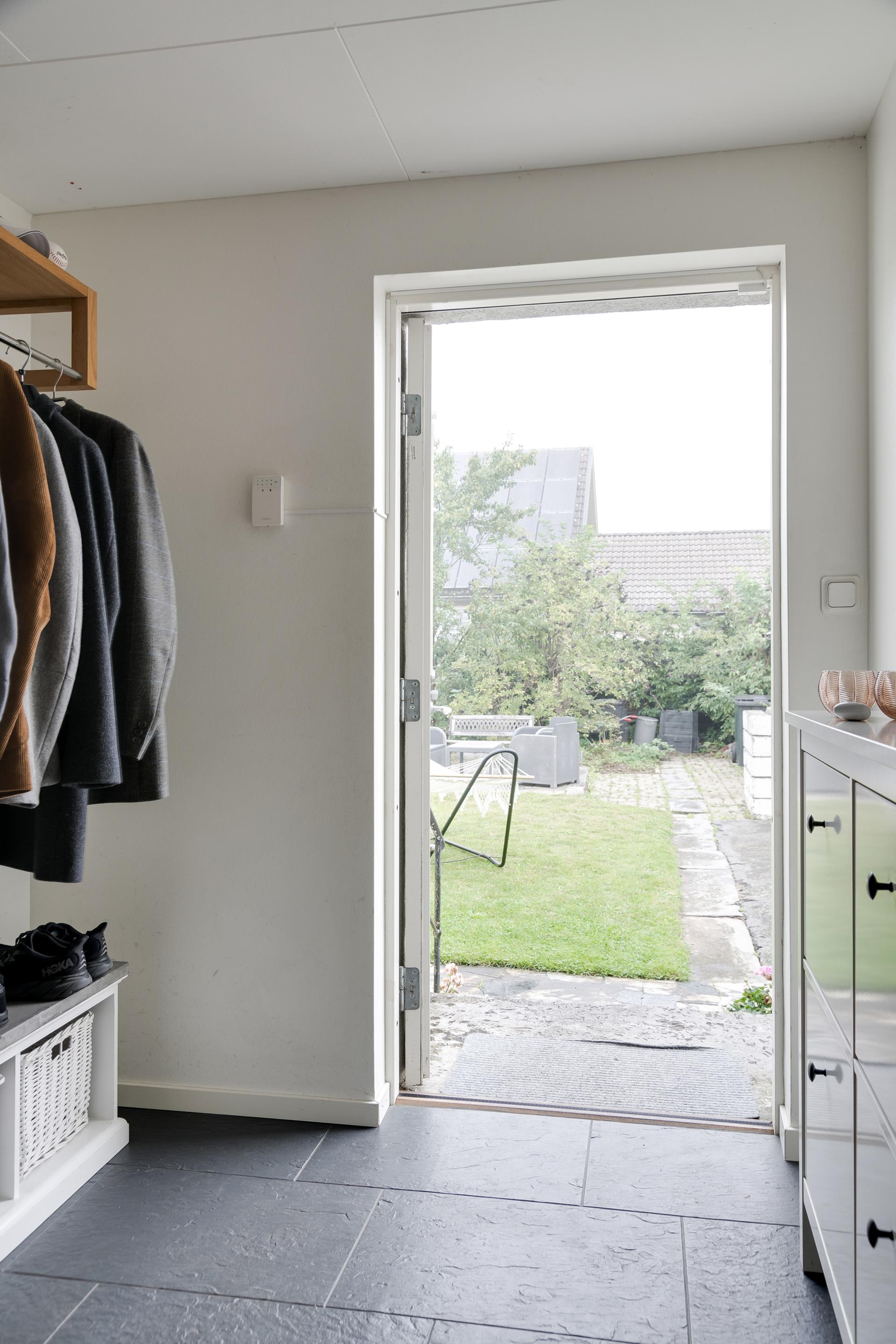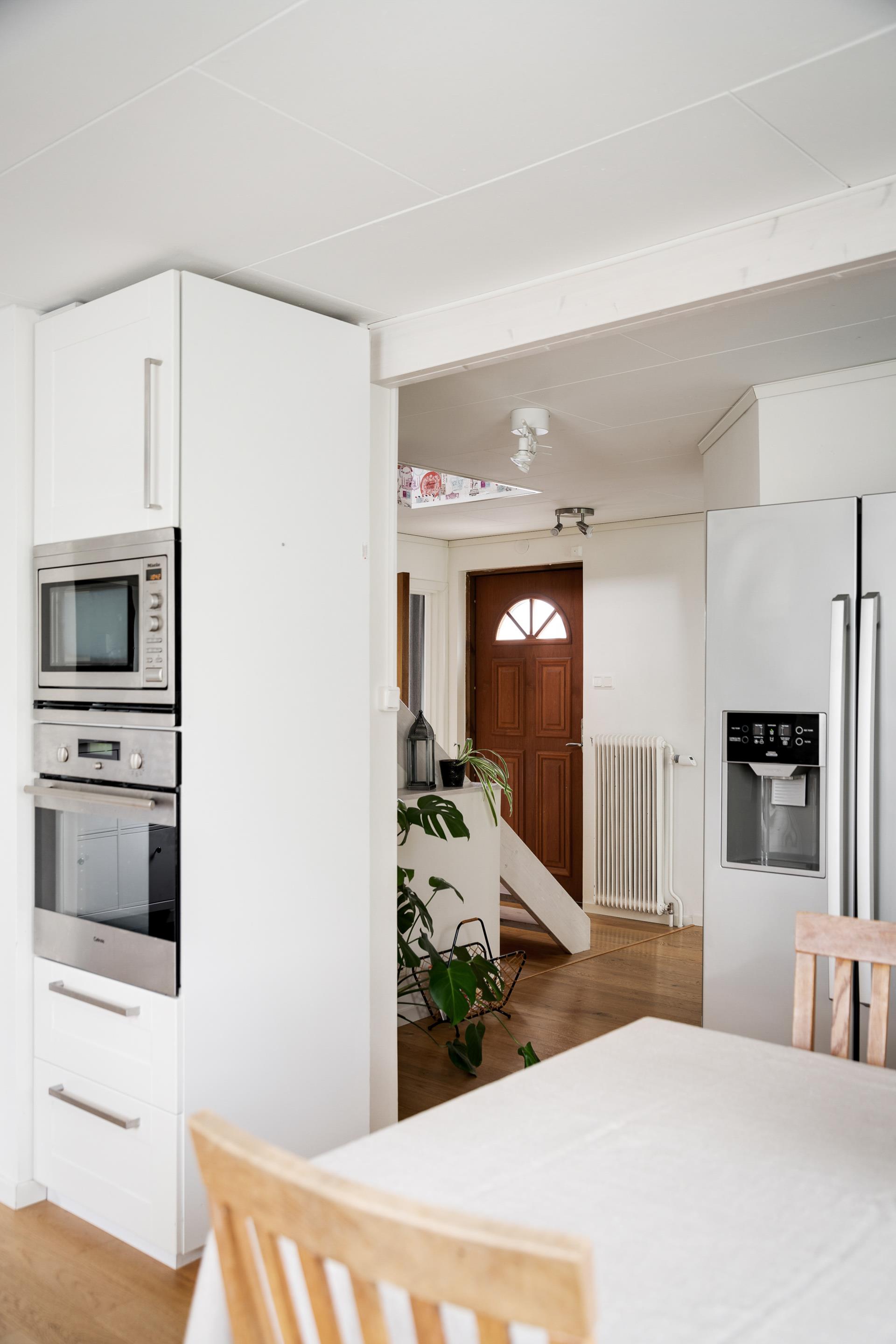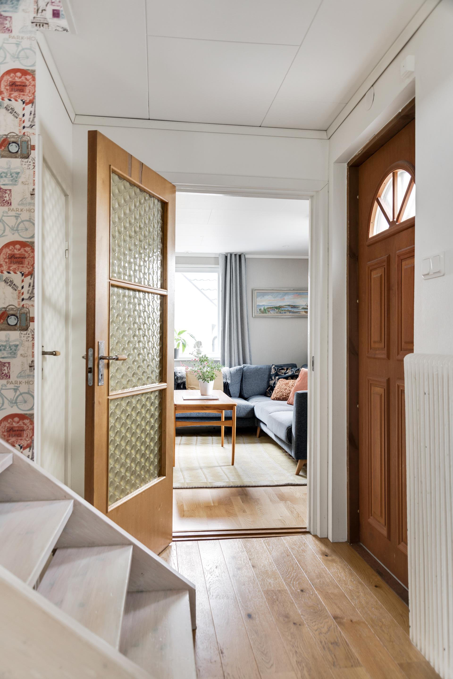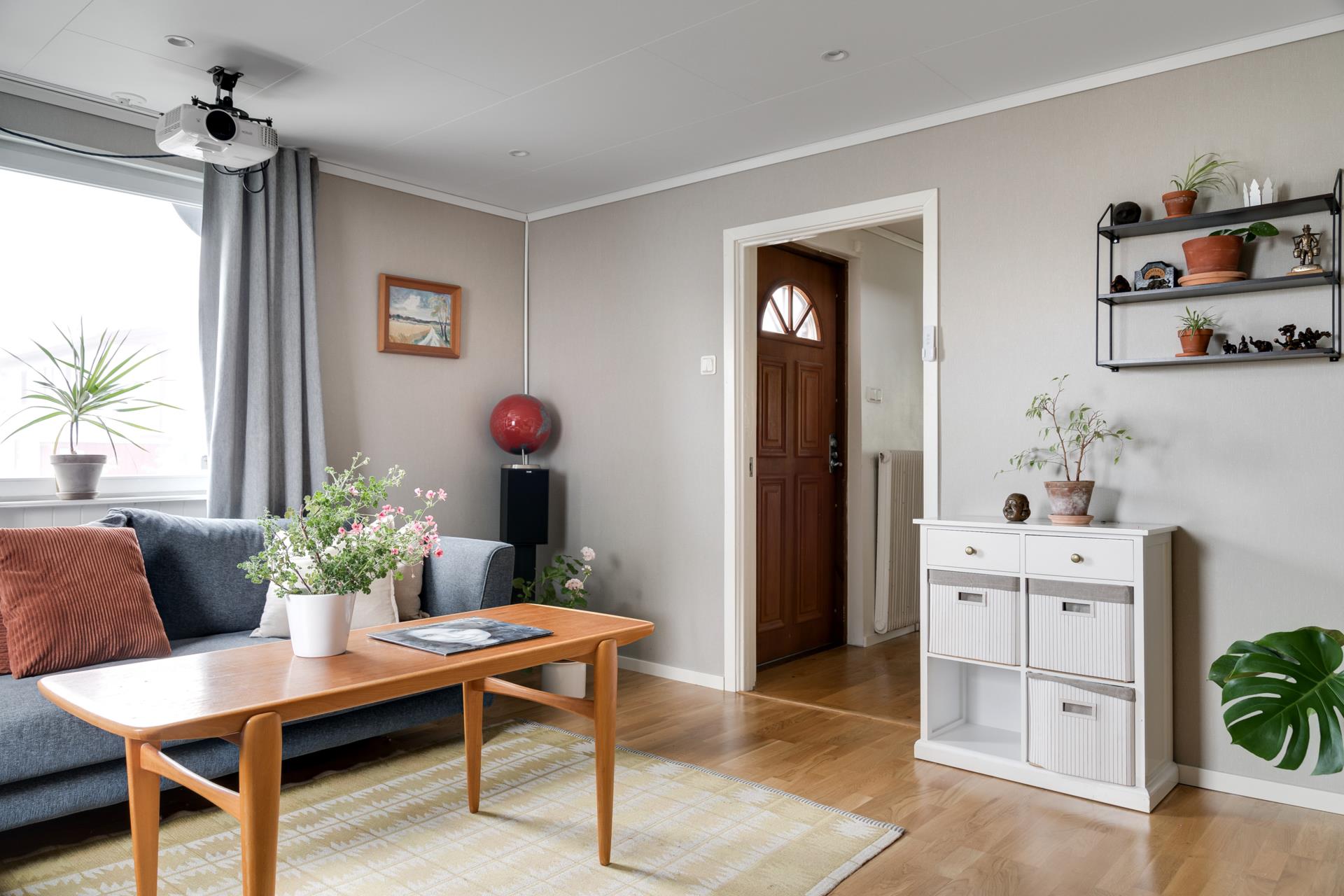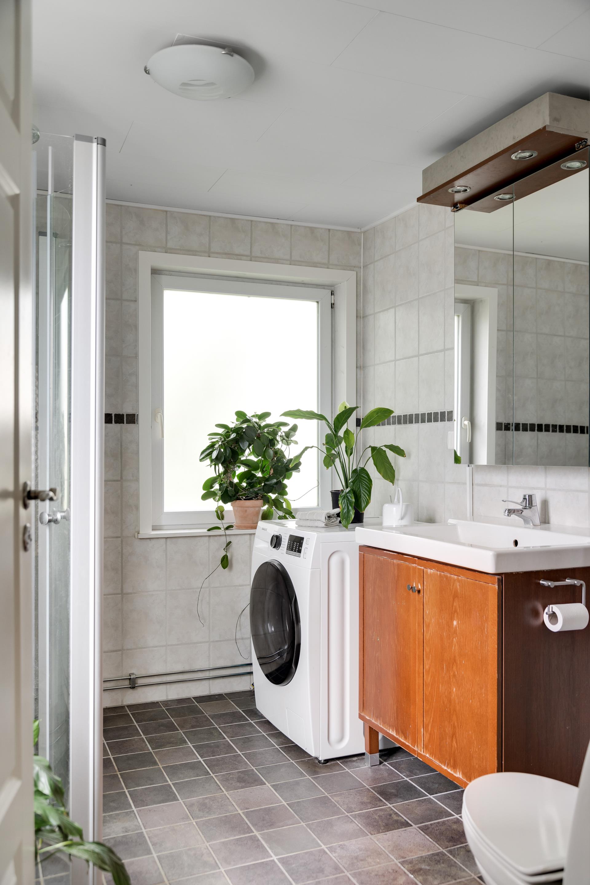 På höger sida från hallen nås det välutrustade köket med vattenburen golvvärme där det finns gott om plats för ett matbord med 6 stolar. Här kan du njuta av trevliga middagar med familj och vänner. Förbi köket leder vägen till en andra hall, som ger tillgång till badrummet, även det med vattenburen golvvärme, en gästtoalett placerad strategiskt vid trappan, samt det mysiga vardagsrummet där du kan slappna av och umgås. I vardagsrummet är det lättmöblerat och på taket finner vi infällda spotlights.