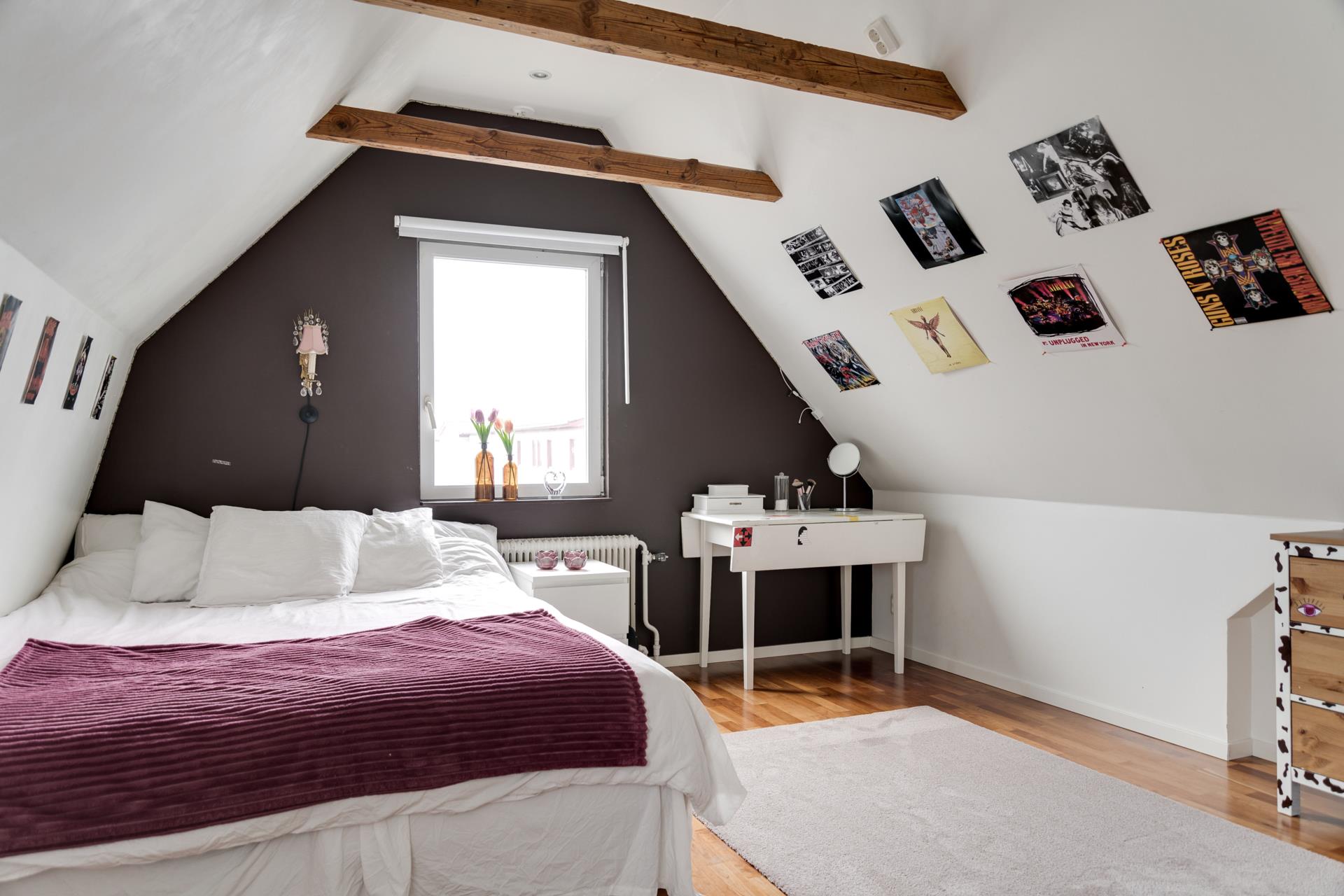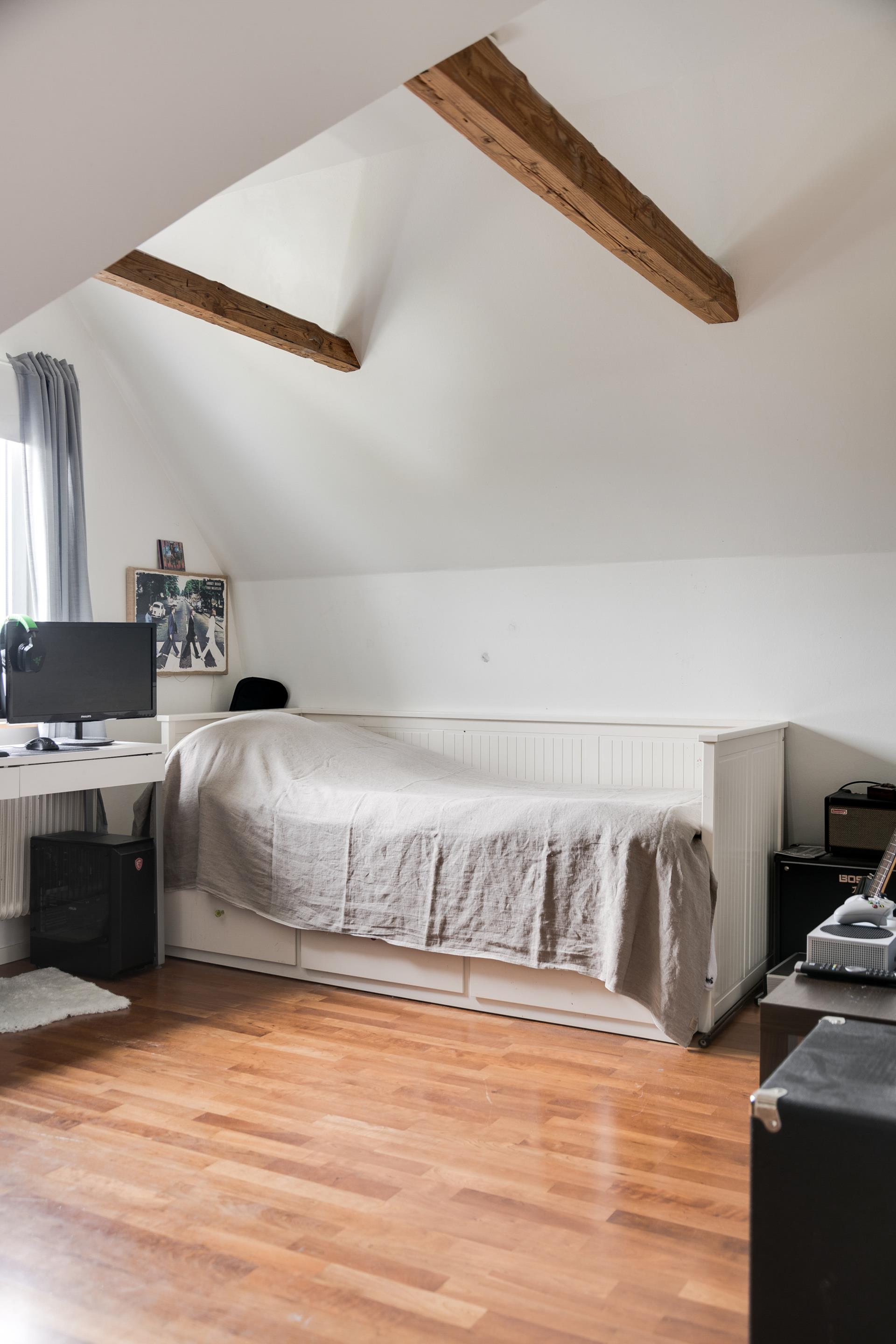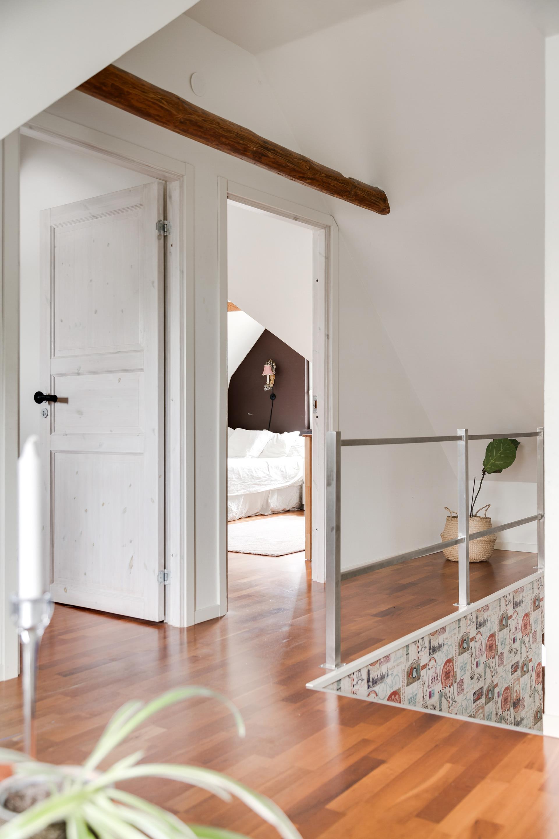 Trappan leder dig upp till ovanvåningen där du möts av ett mindre allrum, perfekt som ett lugnt läshörn eller spelrum för barnen. Här finns även tre ytterligare sovrum, alla ljusa och välplanerade. På ovanvåningen framträder charmiga synliga bjälkar i taket, vilket adderar till husets varma och välkomnande atmosfär. På övre plan finns även fina spotlights i taket.