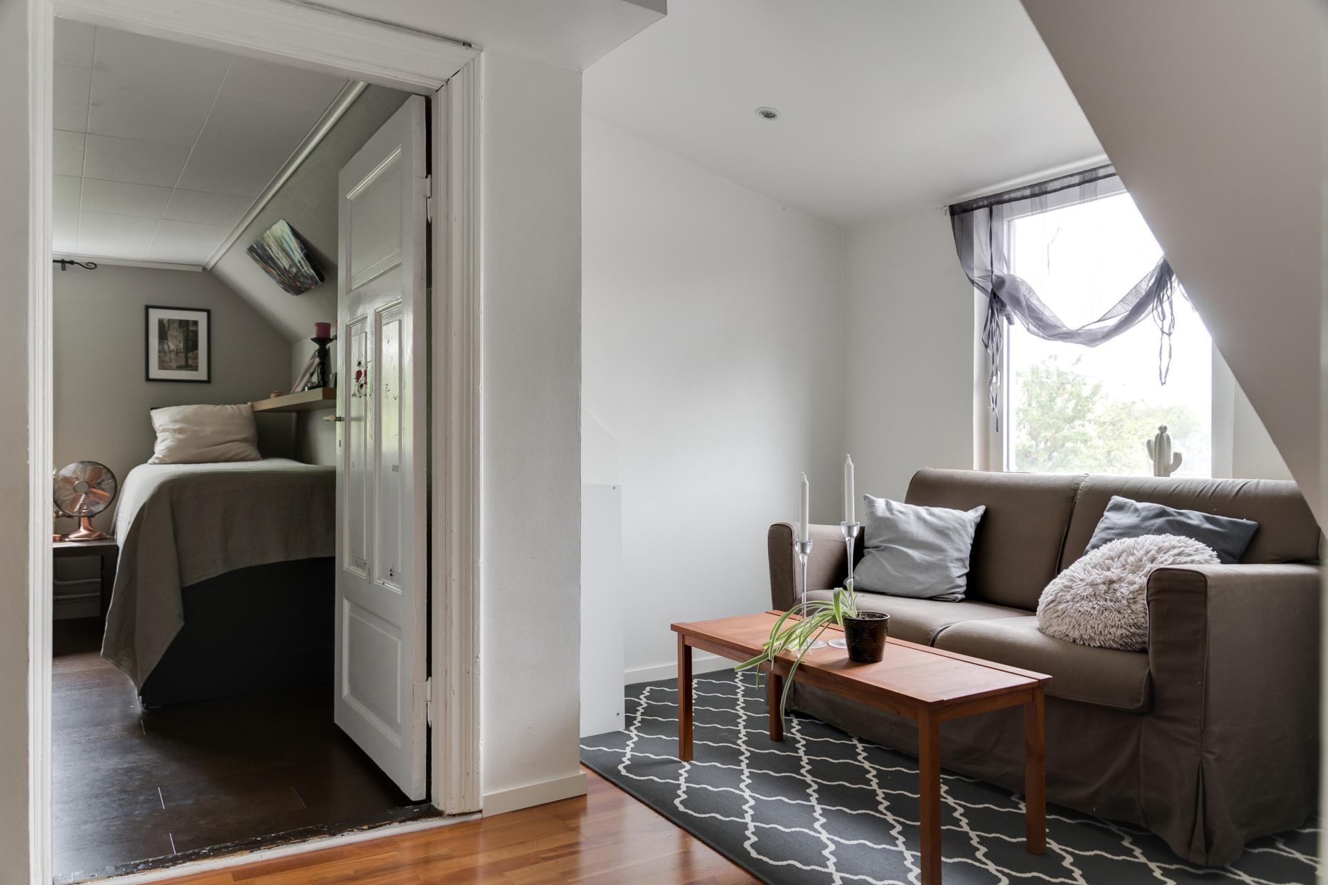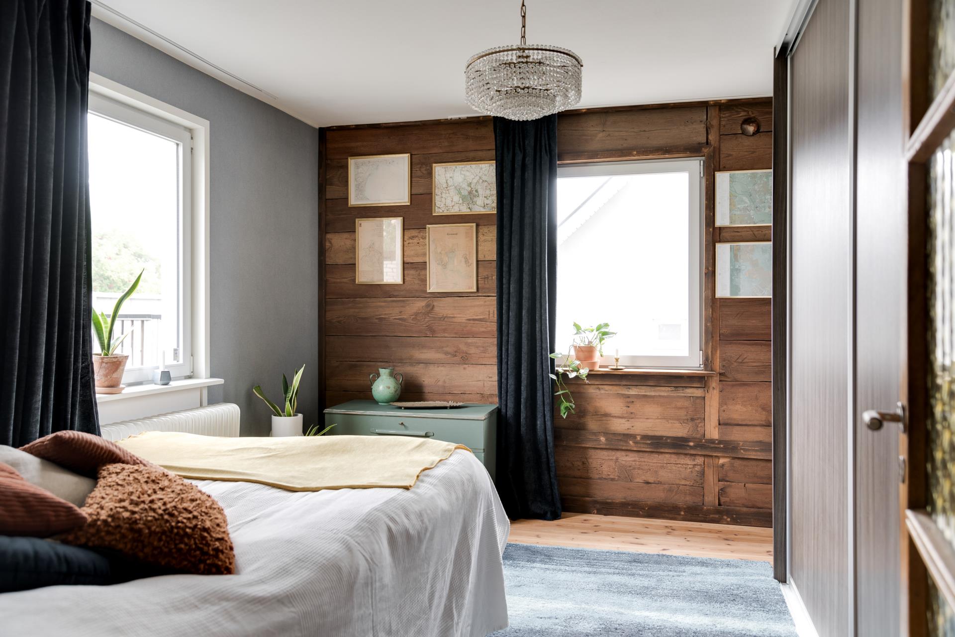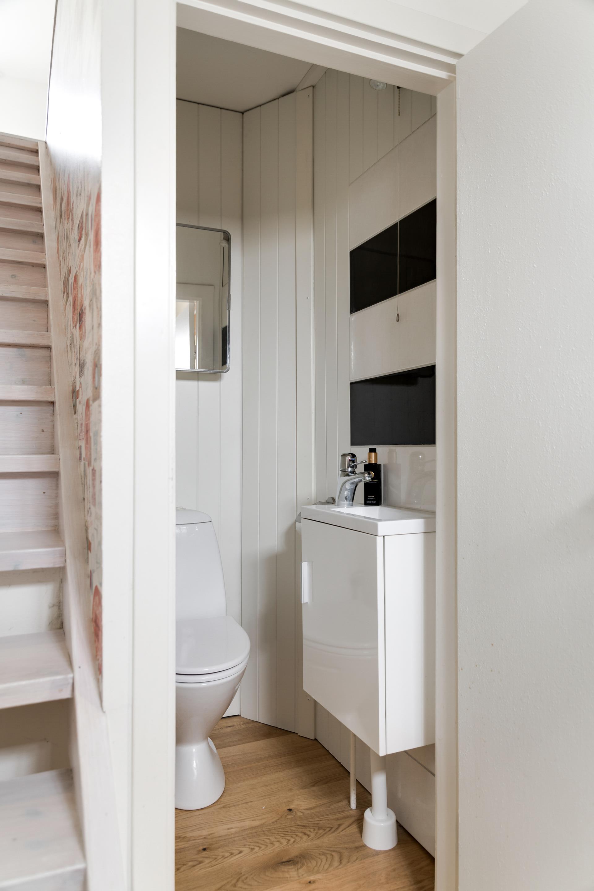 Trappan leder dig upp till ovanvåningen där du möts av ett mindre allrum, perfekt som ett lugnt läshörn eller spelrum för barnen. Här finns även tre ytterligare sovrum, alla ljusa och välplanerade. På ovanvåningen framträder charmiga synliga bjälkar i taket, vilket adderar till husets varma och välkomnande atmosfär. På övre plan finns även fina spotlights i taket.