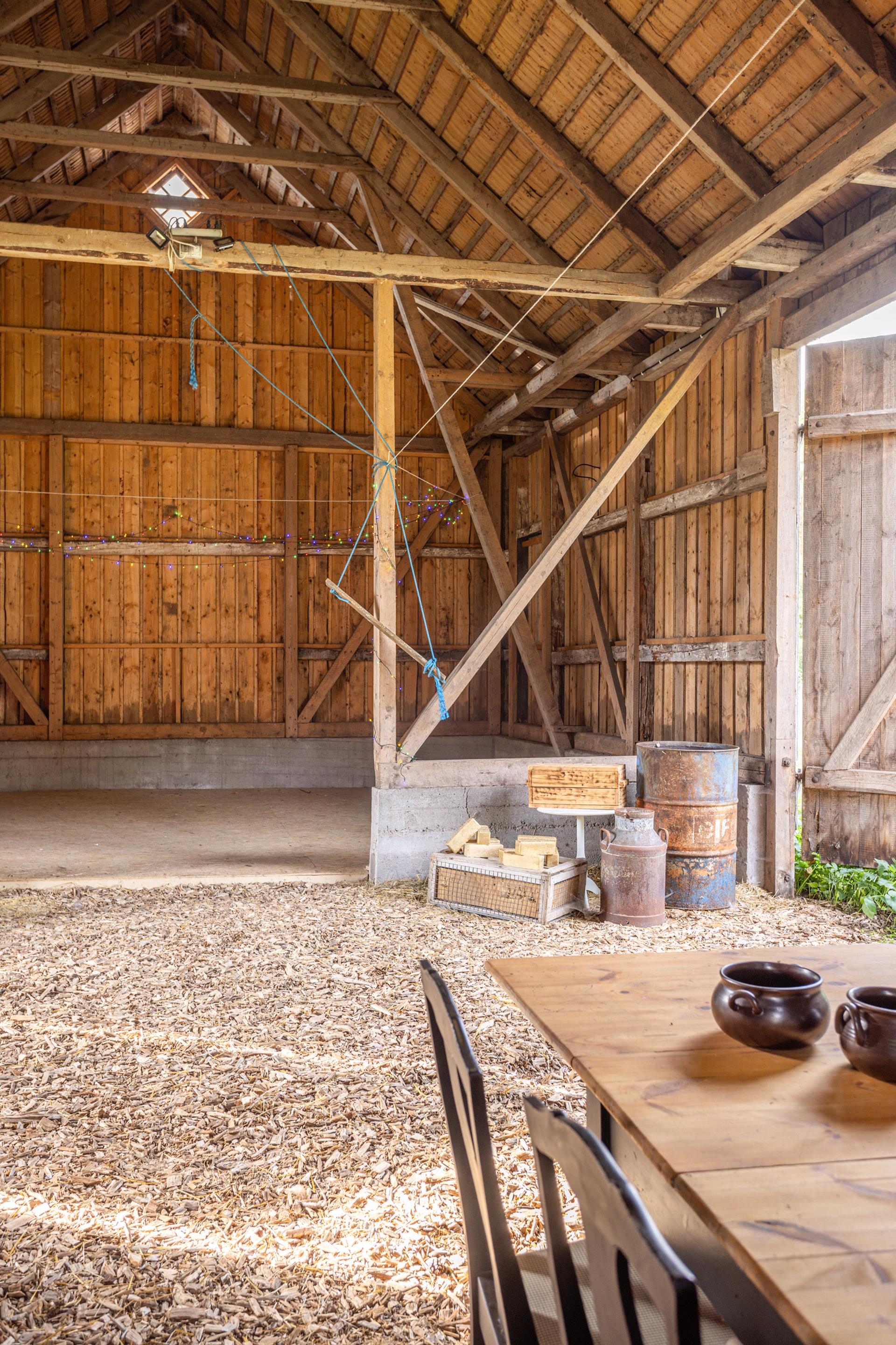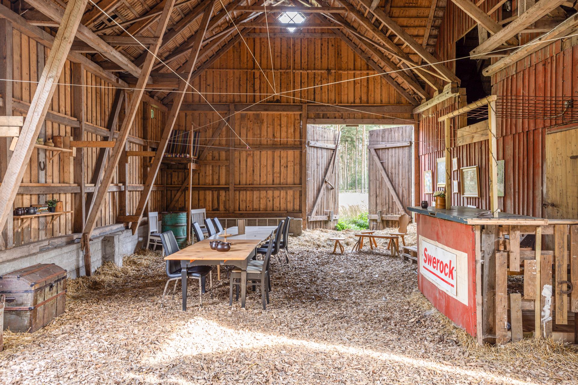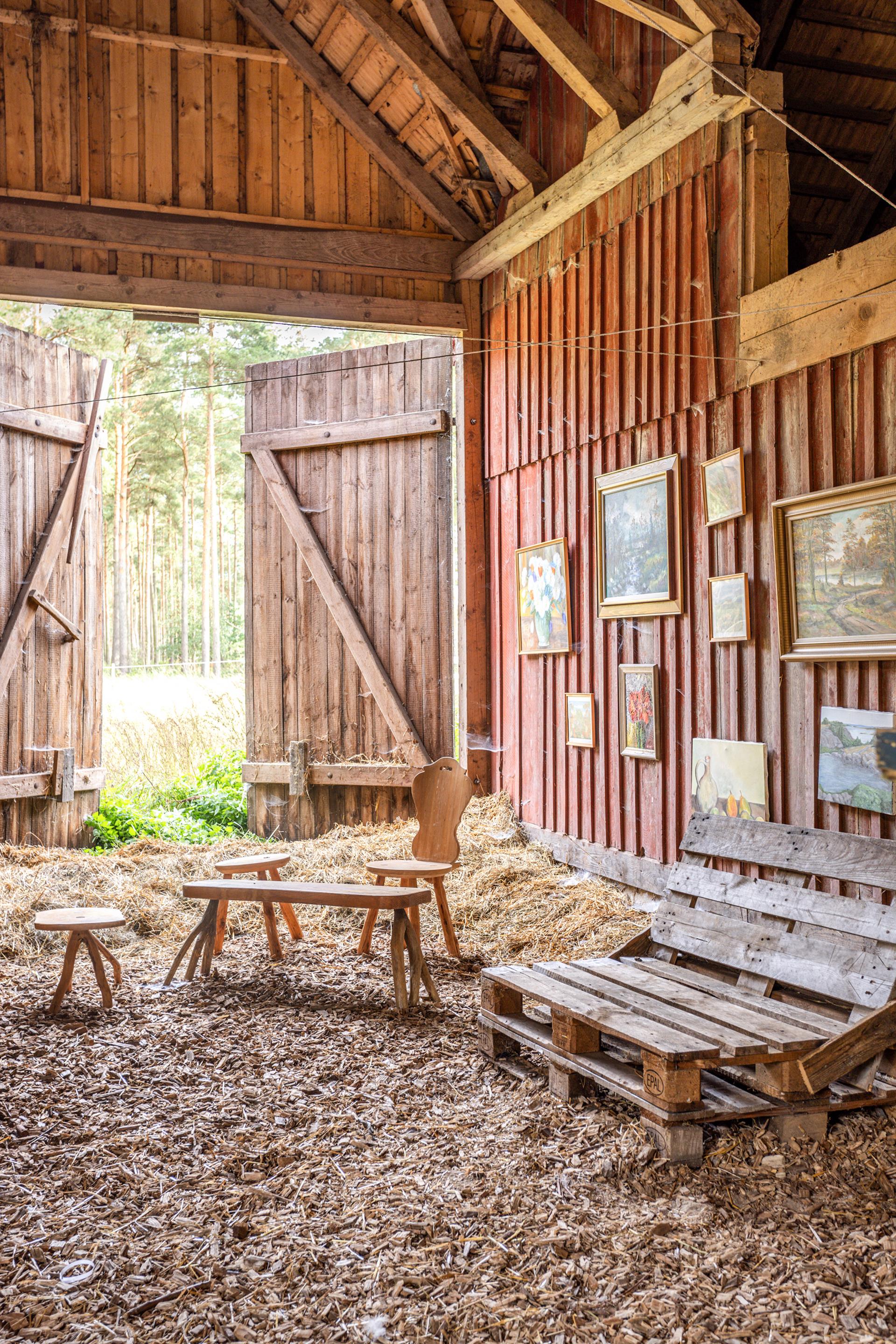 Fastigheten erbjuder även gott om utrymme för dig som vill kombinera boende med intressen eller verksamhet. Här finns ett stort garage/förråd samt en ladugårdslänga i vinkel. En del av ladugården rymmer idag en charmig festlokal, medan övriga ytor kan anpassas efter behov, exempelvis för hobbyverksamhet, ateljé, mindre djurhållning eller förvaring. Ovanför finns en rymlig vind med ytterligare utvecklingsmöjligheter.