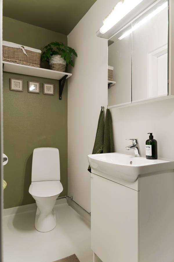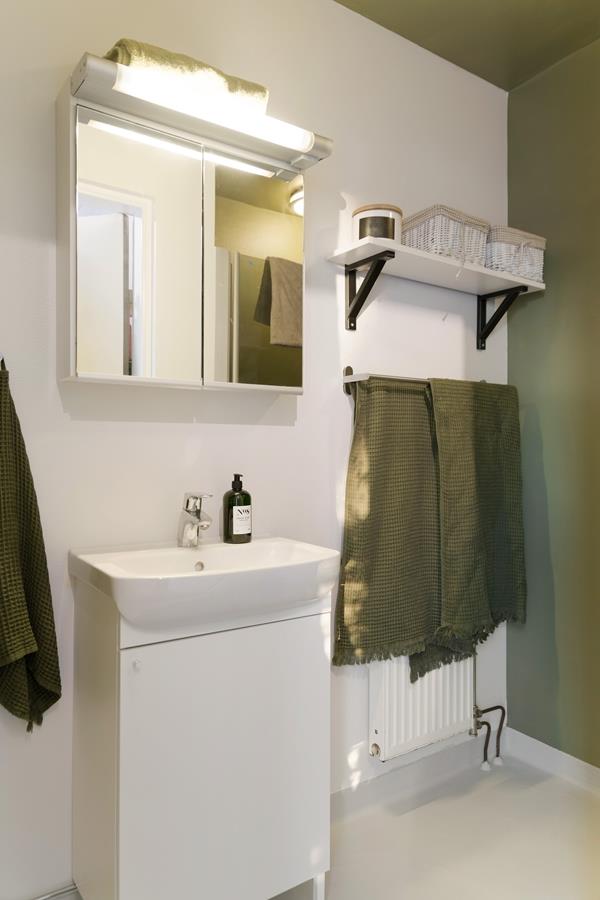 Från hallen nås även badrummet där man nyligen har fräschat upp ytskikten. Här finns det wc, tvättställ med kommod och dusch.
