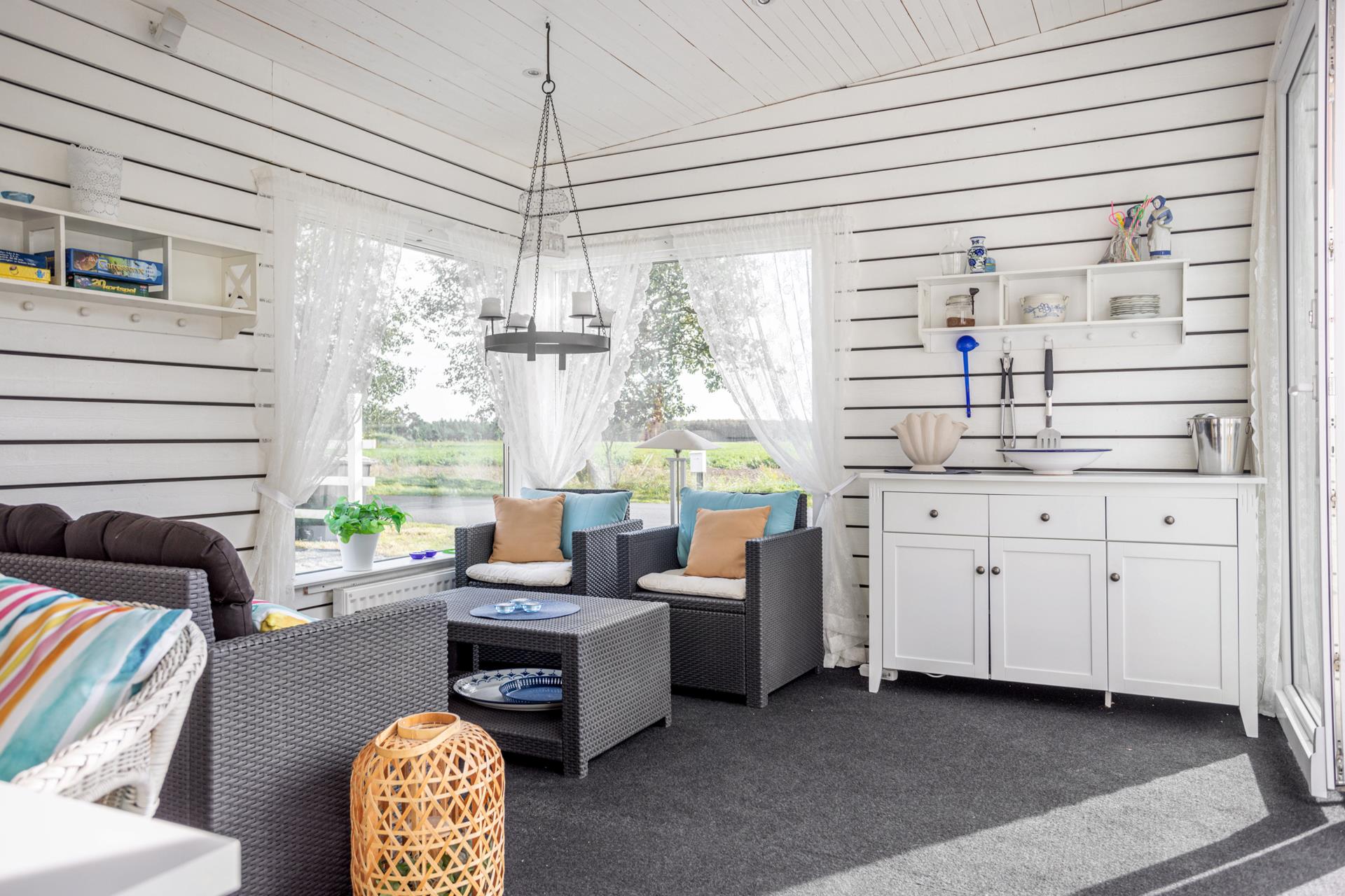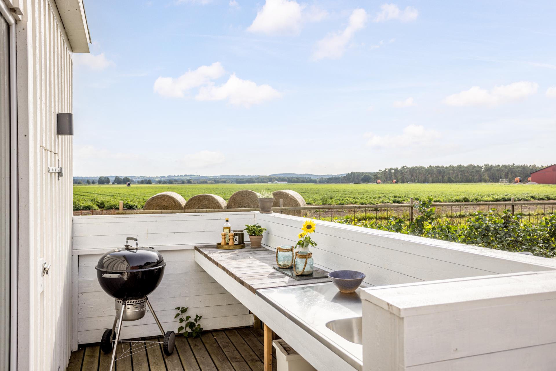 Den stora altanen i söderläge blir snabbt en favoritplats, fri utsikt över omgivningarna och vyer som sträcker sig bort mot Österlen. Här njuter du av solen från morgon till kväll i en lugn och harmonisk miljö. Intill finns ett vinterbonat uterum som förlänger säsongen och skapar en naturlig plats för umgänge året om, samt ett praktiskt utekök för långa middagar och sociala tillfällen.