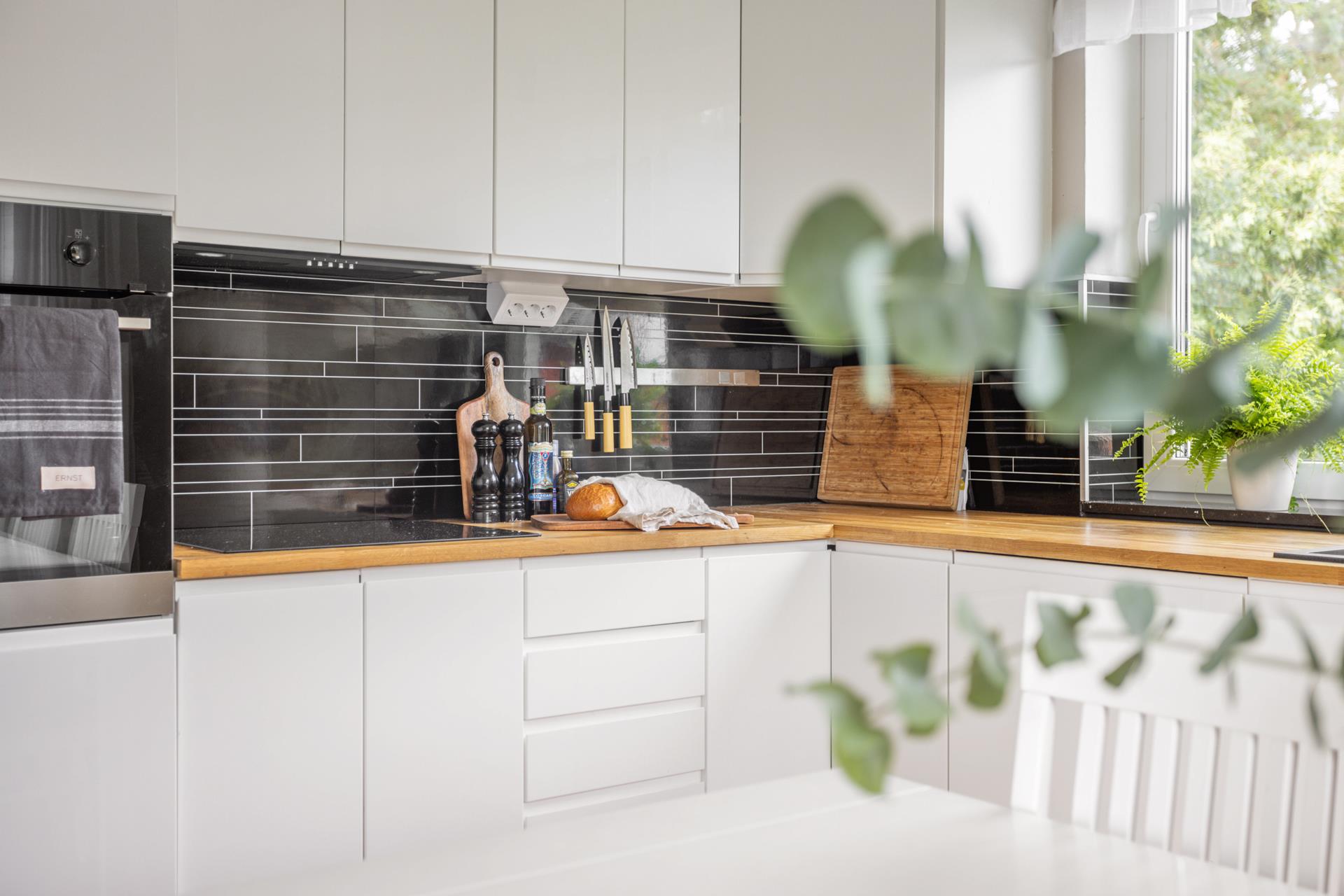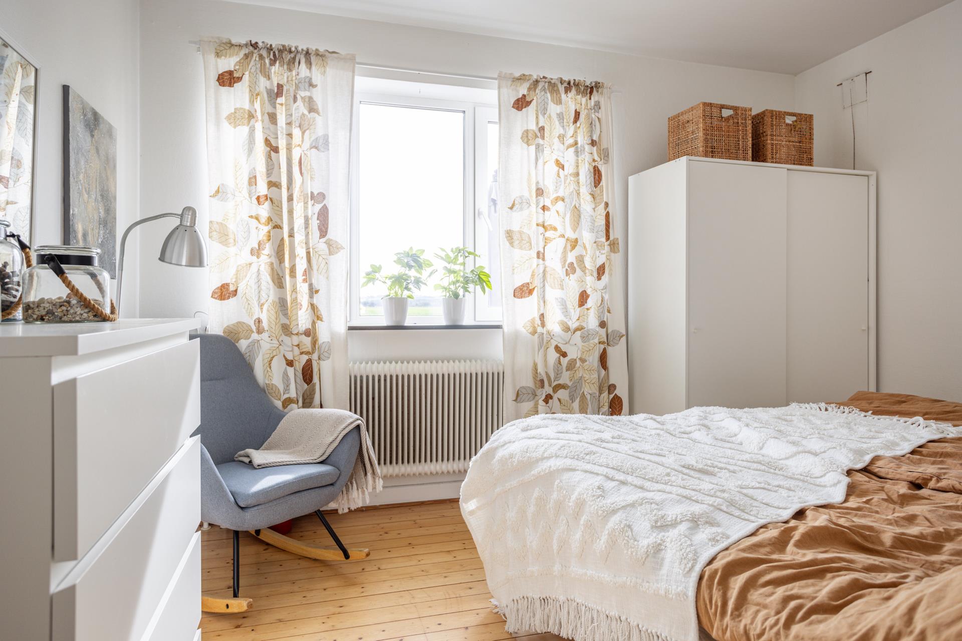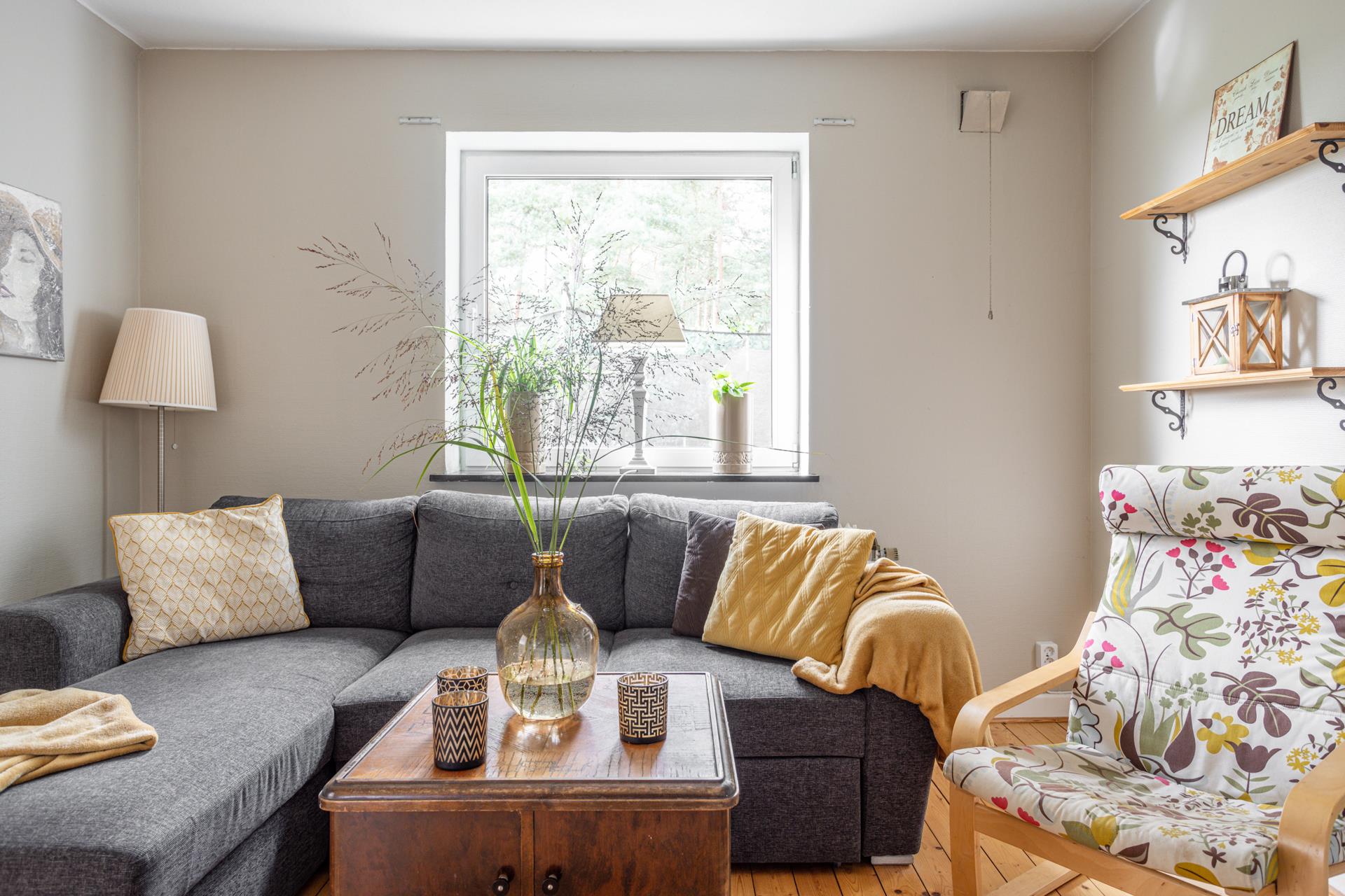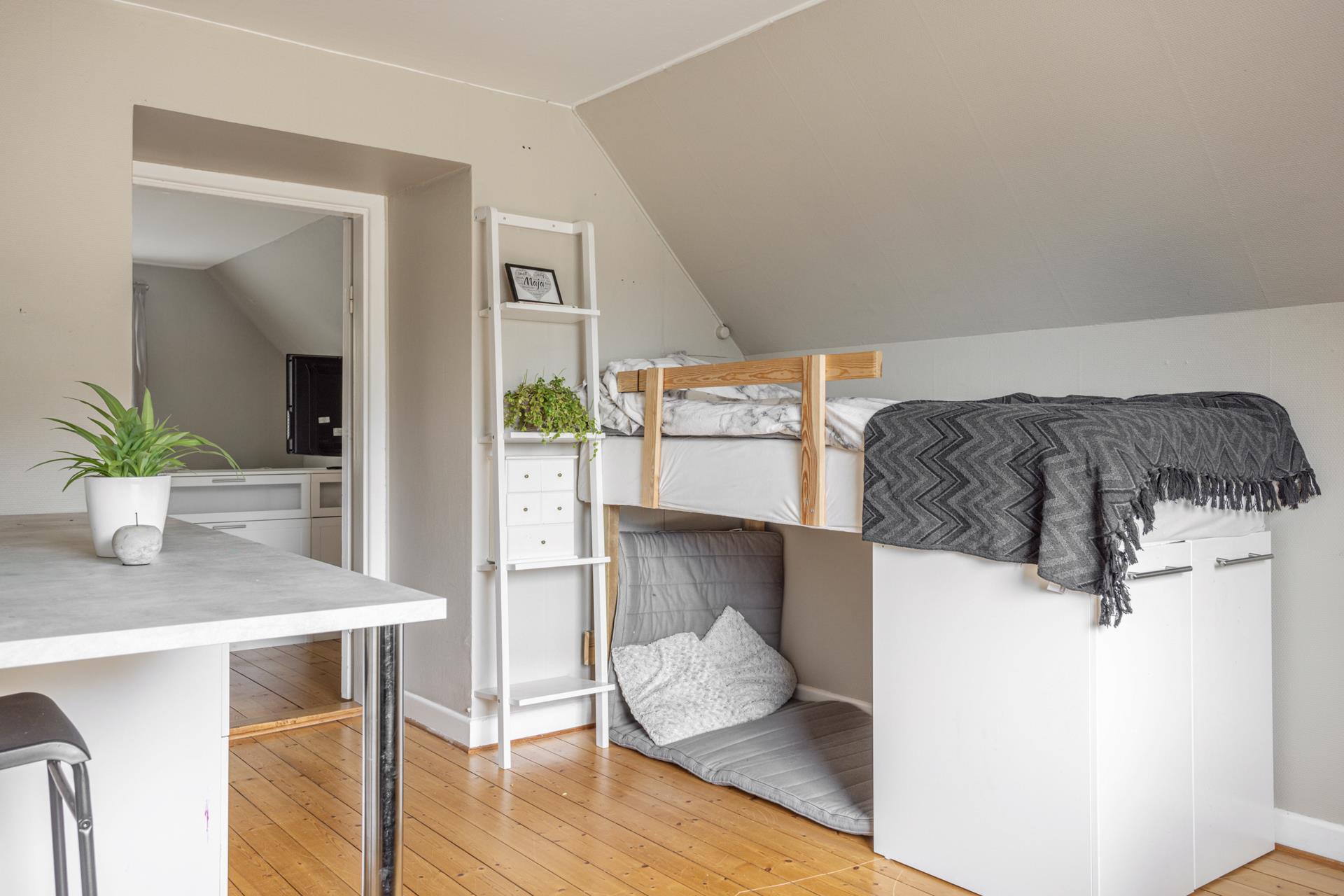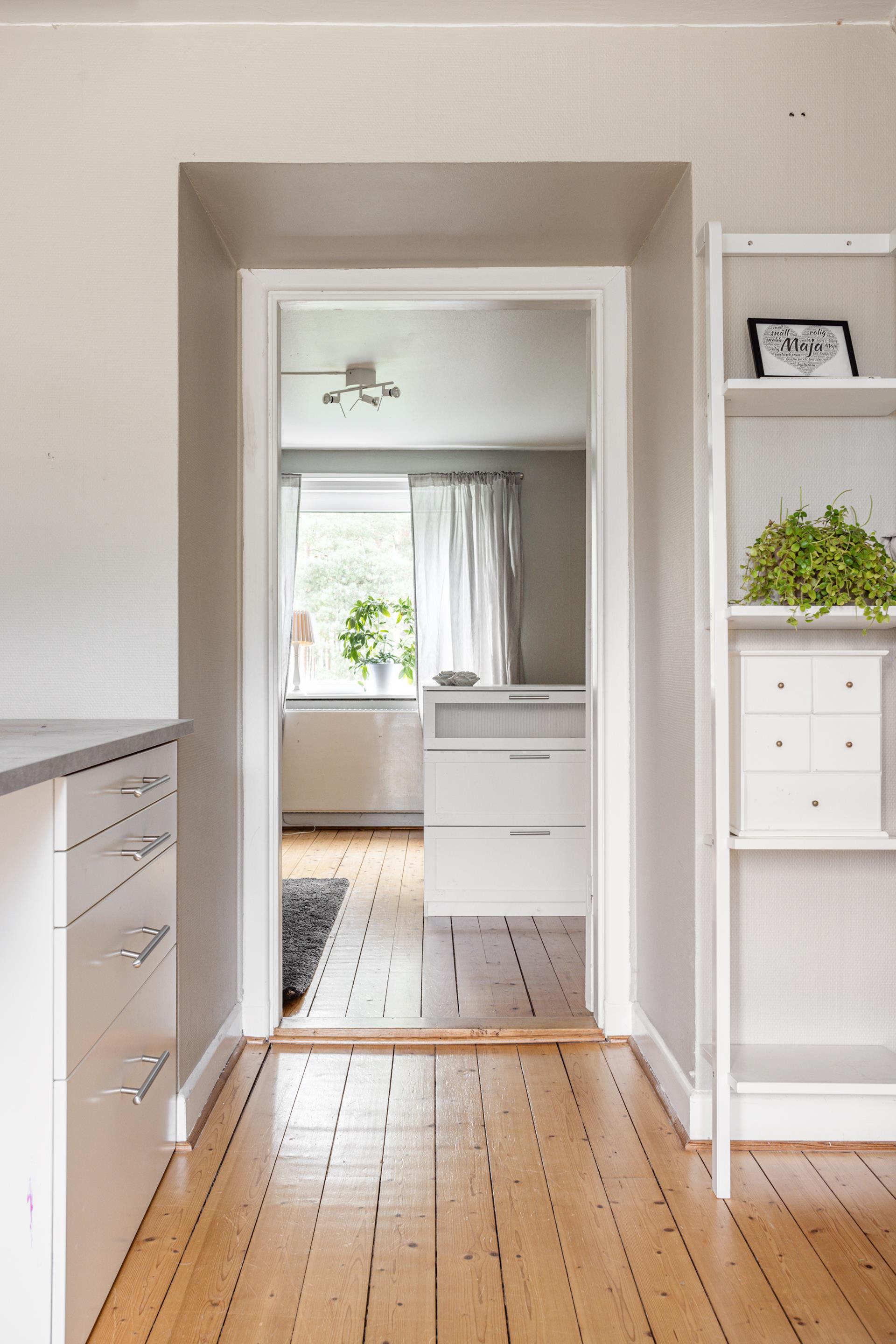 Höger om hallen finner vi det smakfulla köket som är modernt utrustat med bland annat häll, inbyggd ugn och integrerad diskmaskin samt kyl och frys. Här finns det även plats för ett stort matbord med stolar. Vidare kommer vi till det ljusa vardagsrummet följt av ett lättmöblerat sovrum med plats för både dubbelsäng och andra önskvärda möbler.