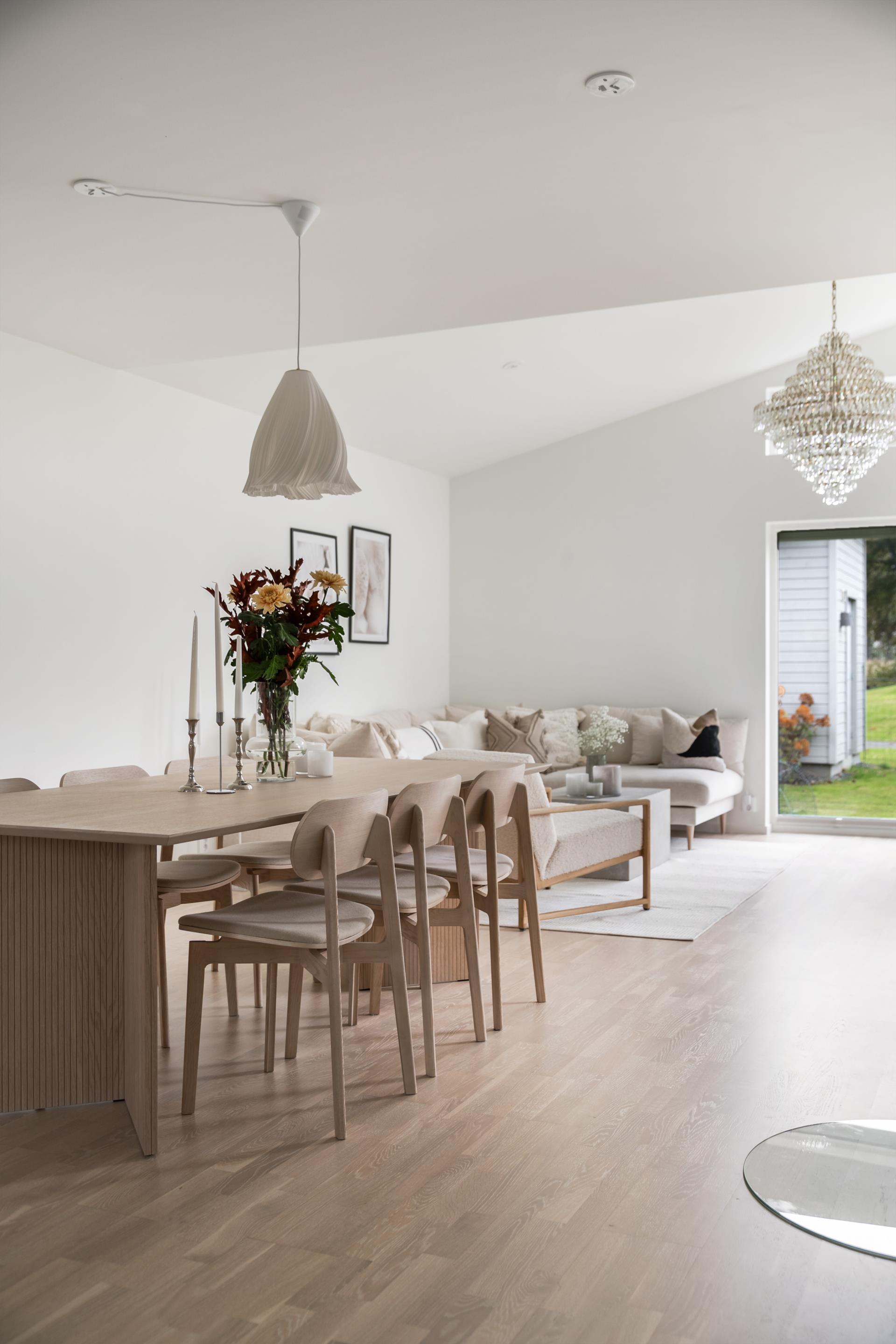 När du kliver in möts du av en ljus och välplanerad interiör. På entréplanet finns ett luftigt vardagsrum med ekparkett och stora fönsterpartier som fyller rummet med ljus. Härifrån nås uteplatsen och den gröna trädgården som blir en naturlig förlängning av hemmet, perfekt för middagar, lek eller avkoppling i solen.