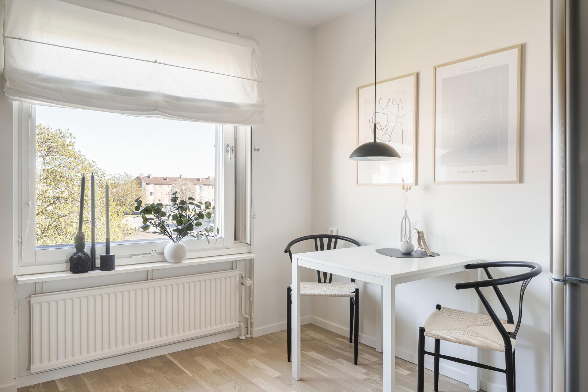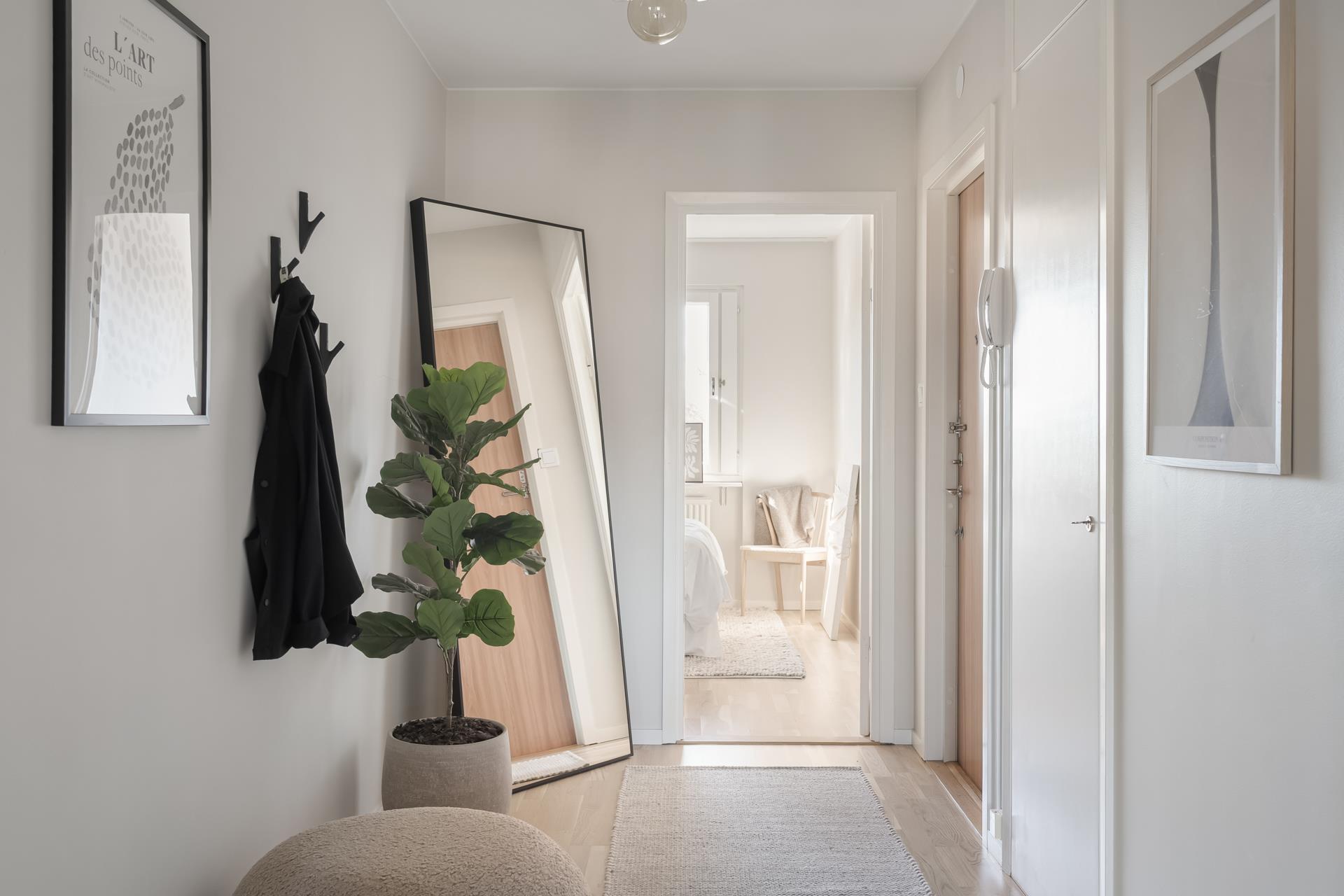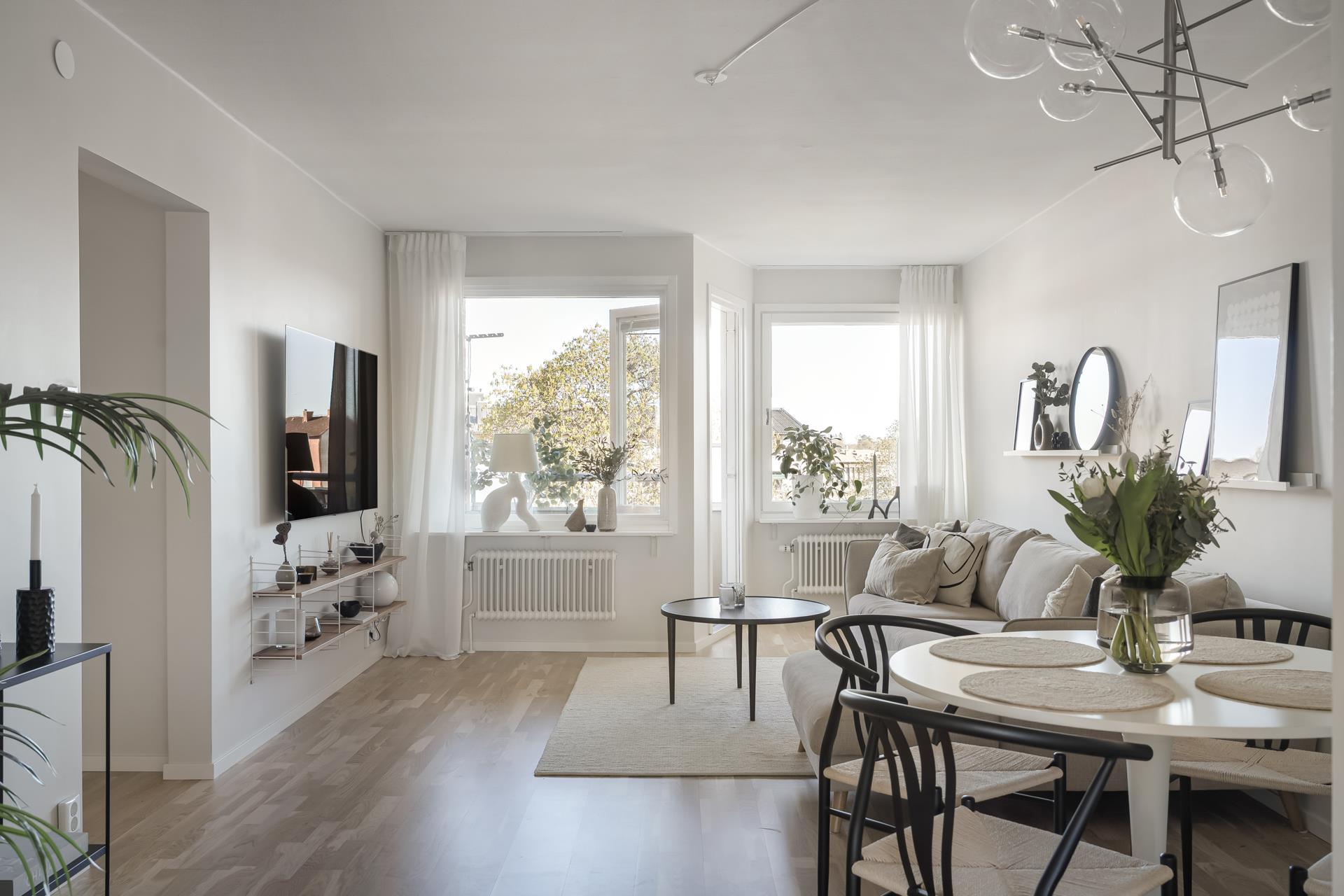 Bostaden erbjuder ett nyrenoverat och läckert helkaklat badrum i en beige färgskala, utrustat med dusch och tvättmaskin. Det ljusa allrummet rymmer både soffgrupp och matplats och har utgång till den mysiga balkongen, vilket skapar en härlig rymd och fint ljusinsläpp. Här finns charmiga pardörrar som leder vidare till ett av bostadens sovrum. Lägenheten erbjuder totalt två ljusa sovrum varav båda två med garderober. Köket är smakfullt utformat och har plats för en mindre matgrupp.