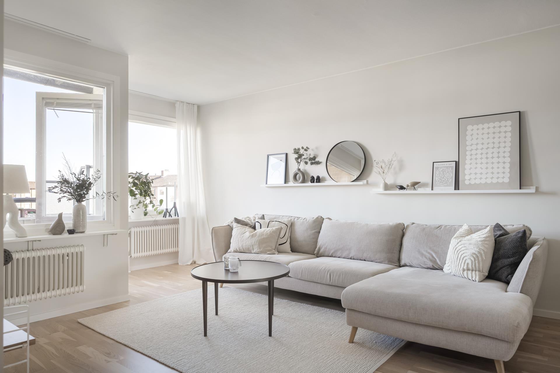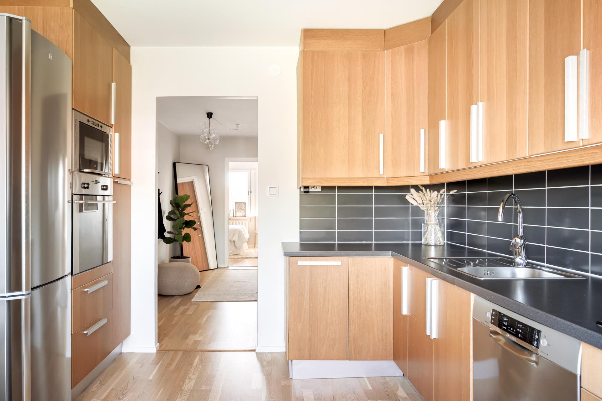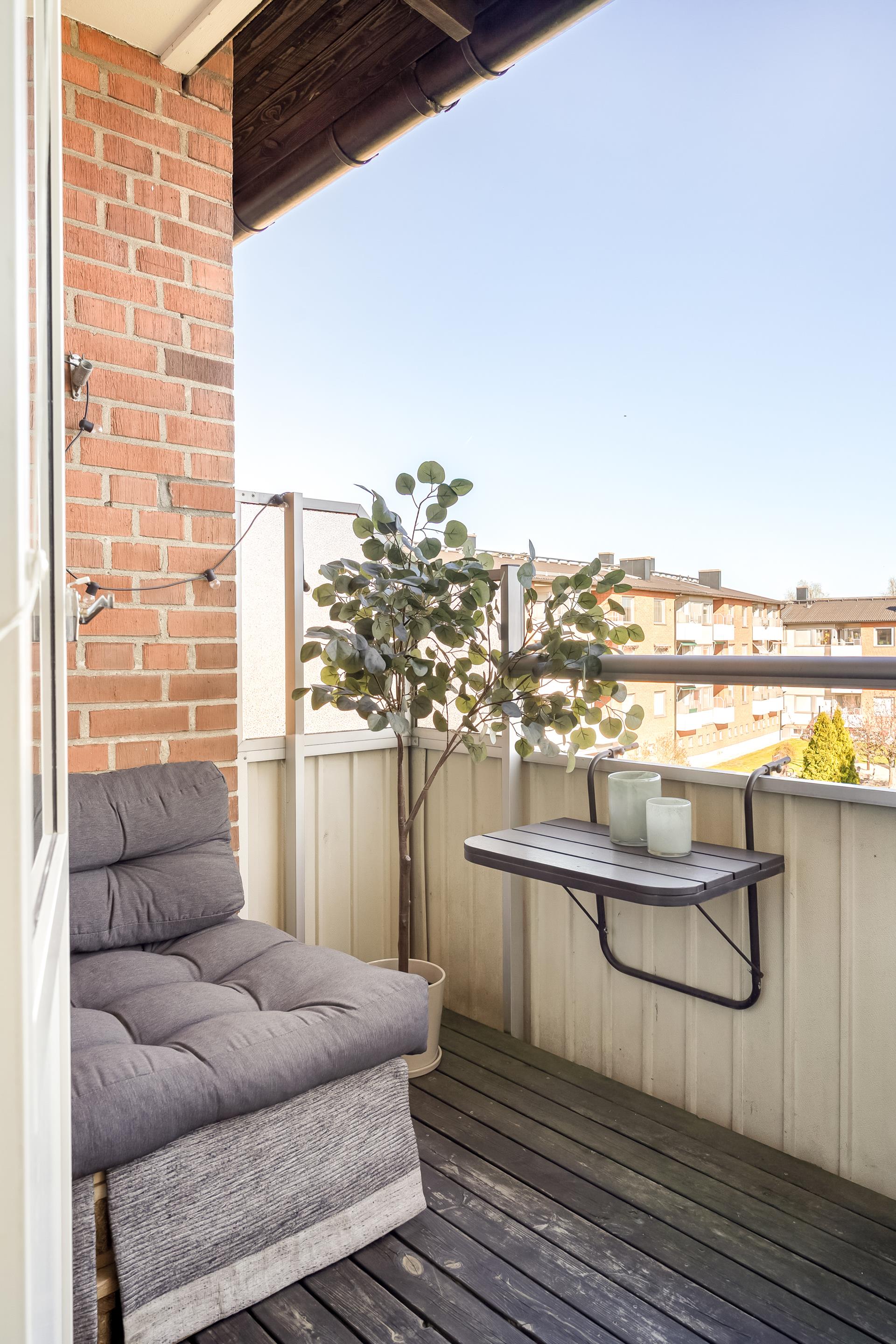 Bostaden erbjuder ett nyrenoverat och läckert helkaklat badrum i en beige färgskala, utrustat med dusch och tvättmaskin. Det ljusa allrummet rymmer både soffgrupp och matplats och har utgång till den mysiga balkongen, vilket skapar en härlig rymd och fint ljusinsläpp. Här finns charmiga pardörrar som leder vidare till ett av bostadens sovrum. Lägenheten erbjuder totalt två ljusa sovrum varav båda två med garderober. Köket är smakfullt utformat och har plats för en mindre matgrupp.