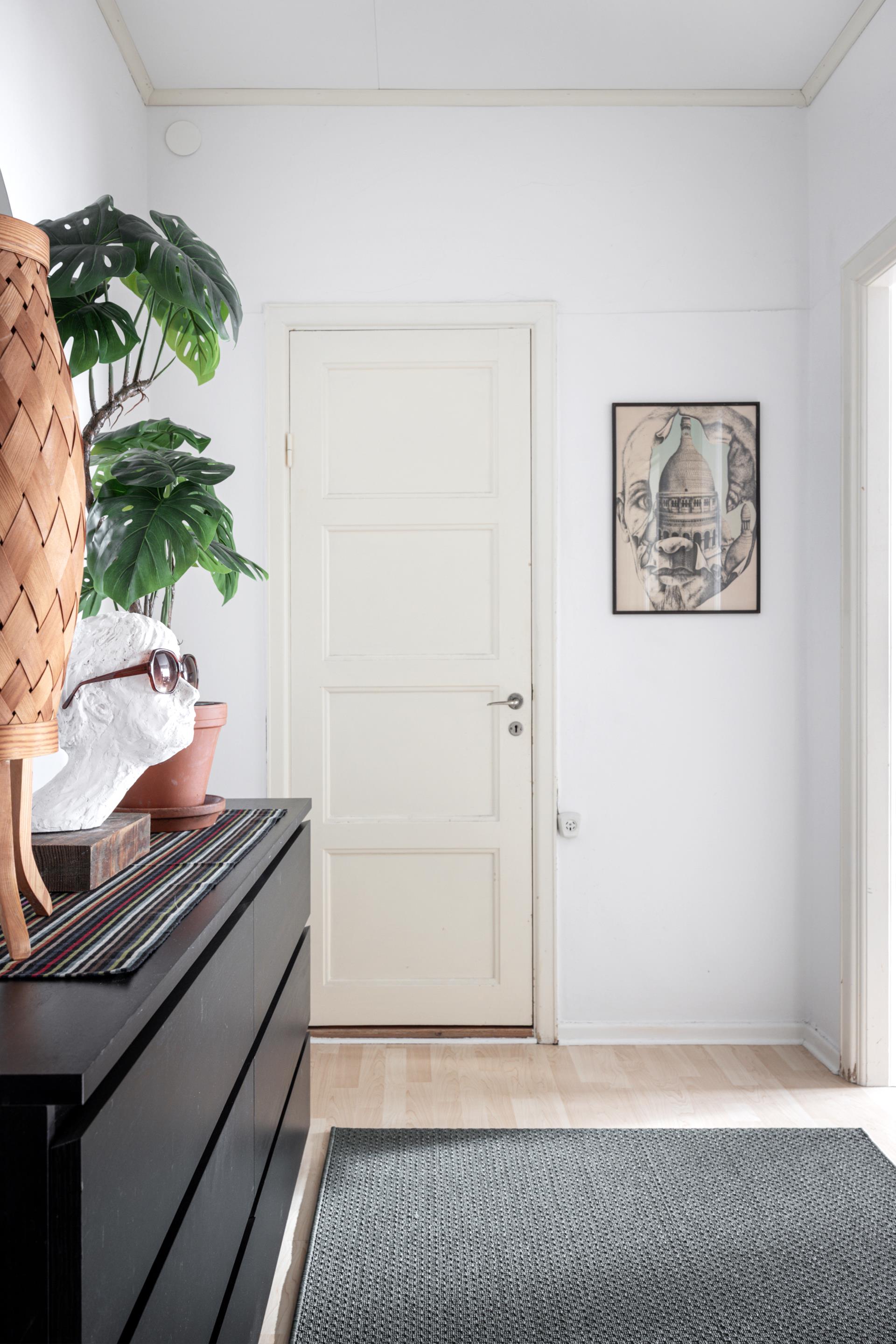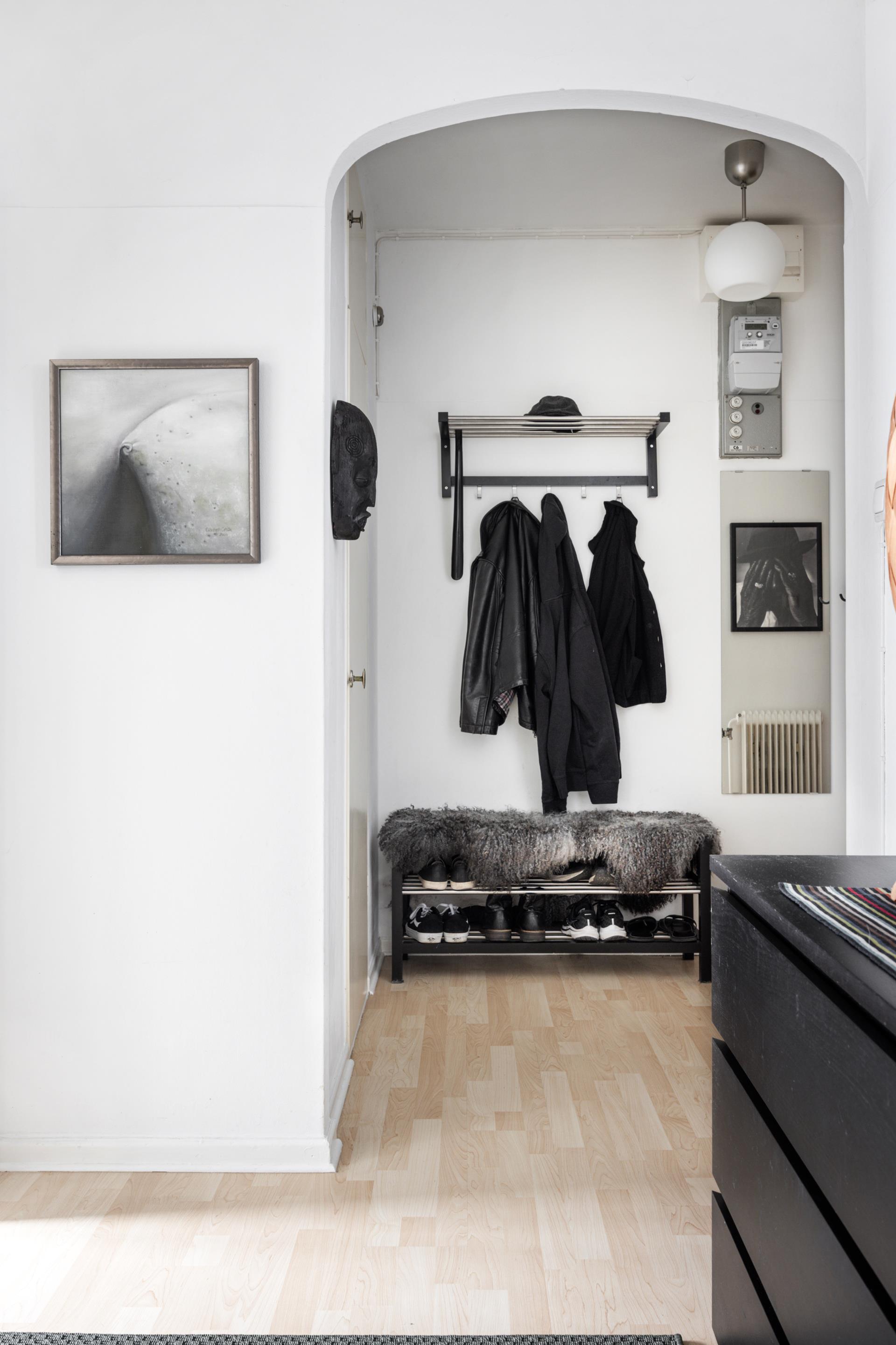 Hall med plats för att hänga av sig ytterkläder och skor. Ljus yta som leder vidare till bostadens övriga rum.