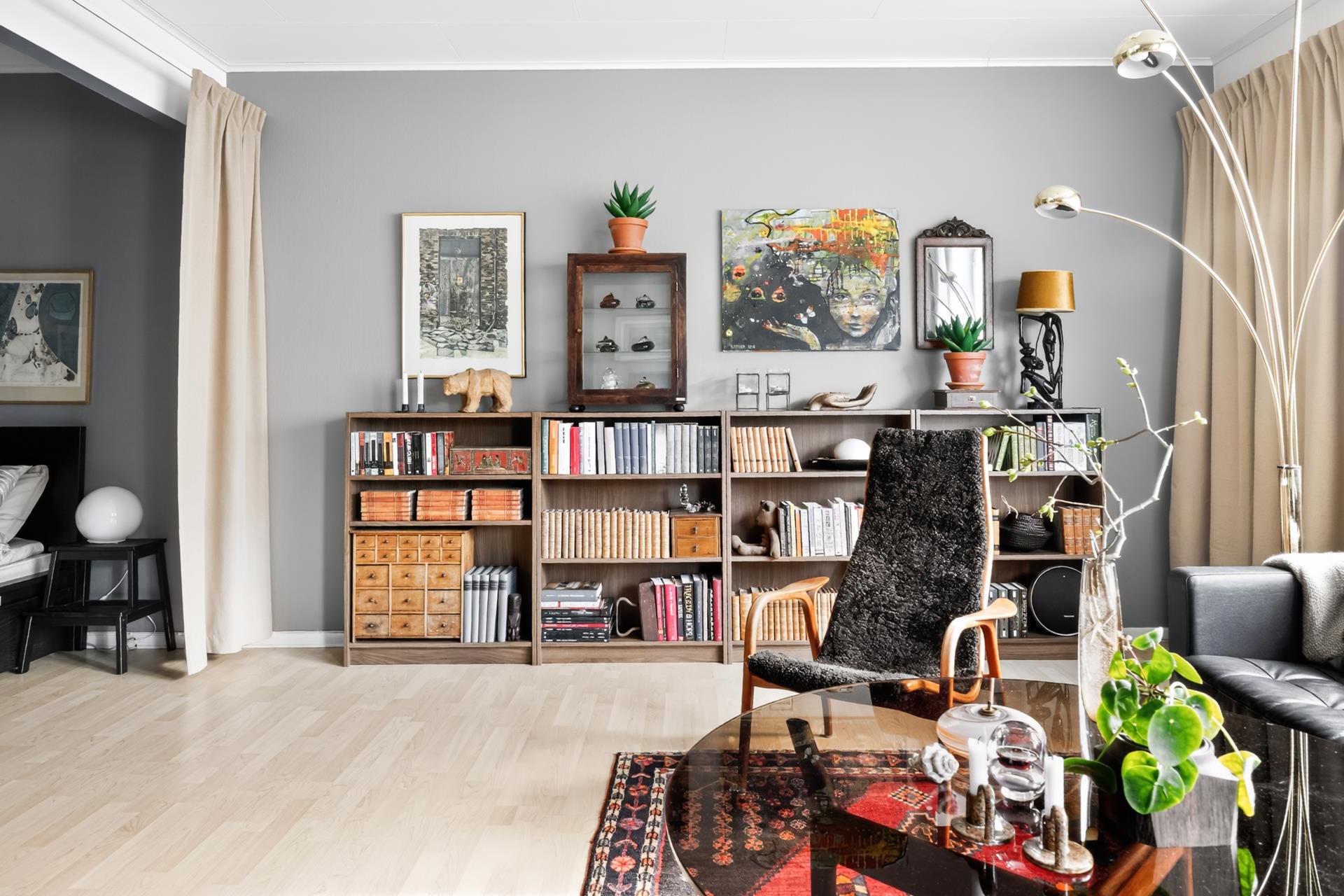 Vardagsrum med parkettgolv och stora fönster som släpper in mycket ljus. Rummet har plats för soffgrupp, bord och annan möblering. Utgång till balkong finns härifrån.